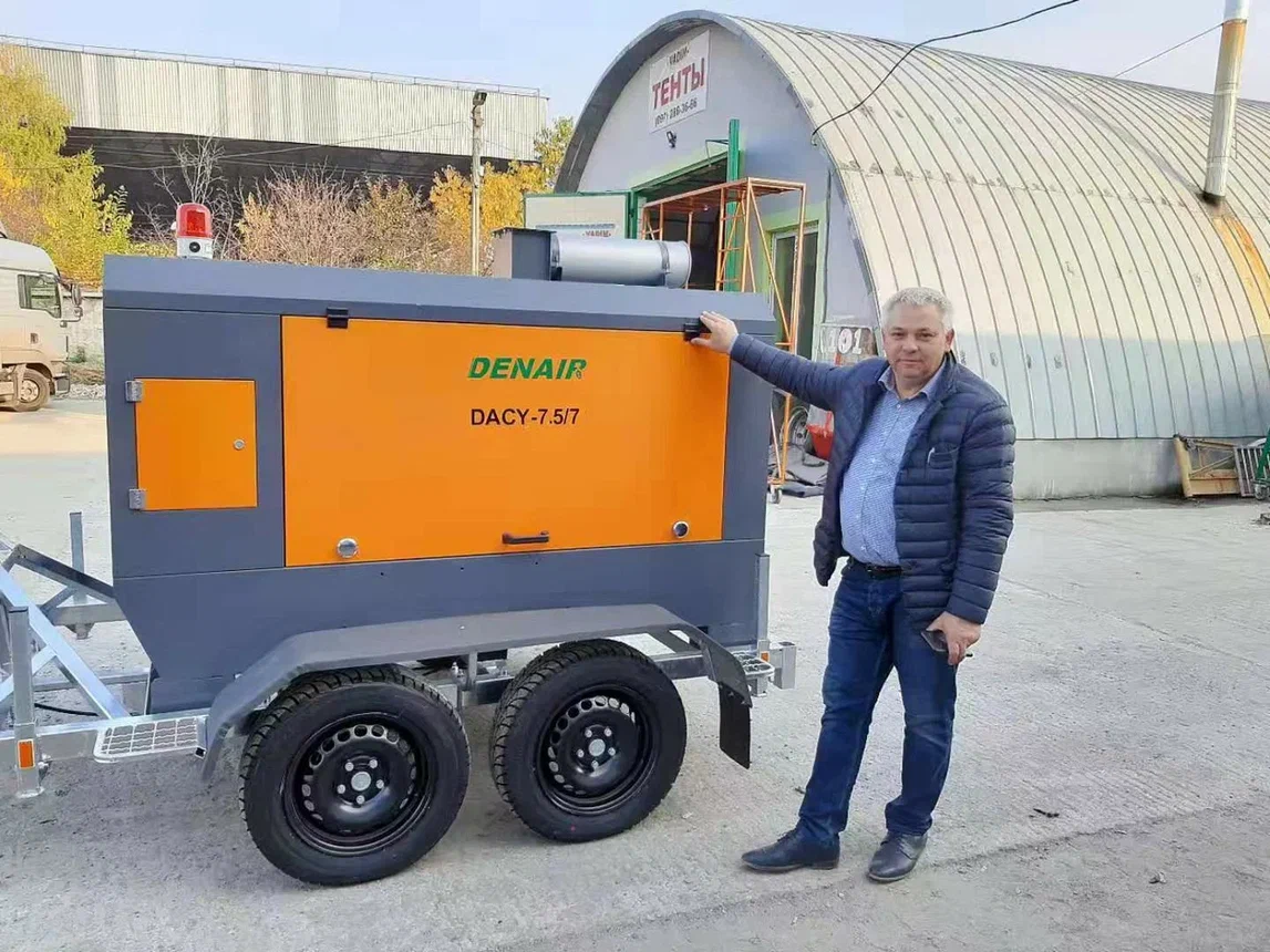 Компрессор с производительностью 7.5 м3/мин. легко передвигаемый между объектами с помощью шасси.